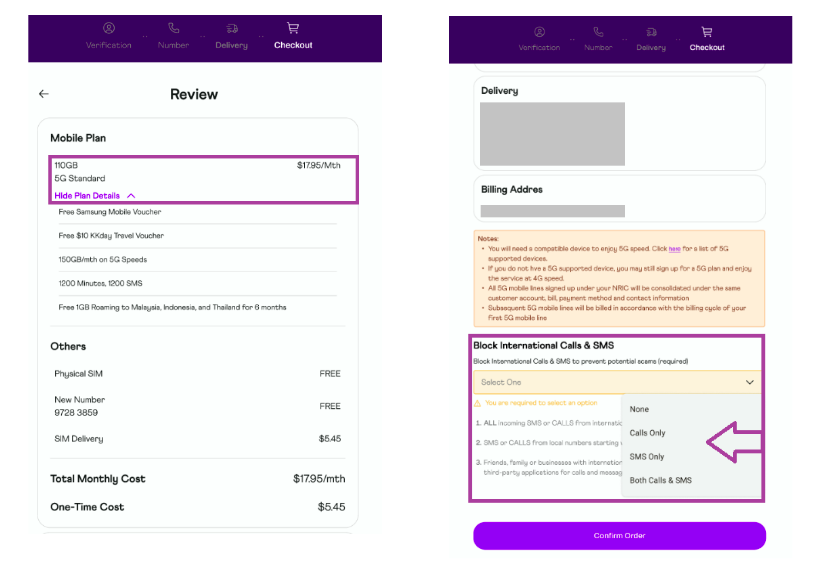 On the "Review" page of the of the Order Portal, customers may select the services that they wish to block before clicking on the "Confirm" button to complete the order. Customers may select from the following: