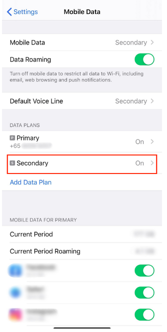 Description: The image above displays the screen for an iOS device to select the default line for Mobile Data when activating the eSIM.