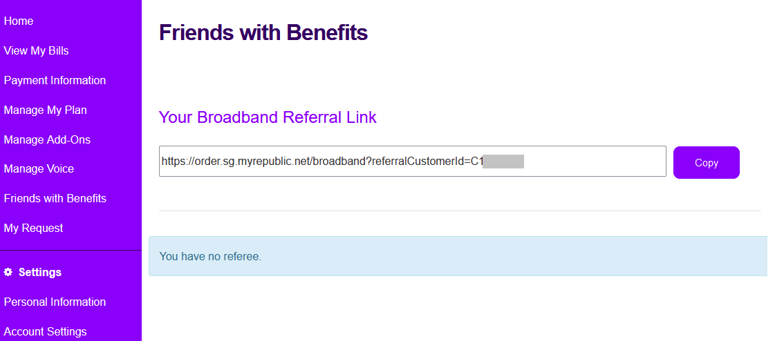 You may retrieve and share your unique referral link in MyAccount, under the Friends with Benefits tab. Your MyRepublic Customer ID (e.g. C1XXXXXX) can be found in the monthly bill we email to you.