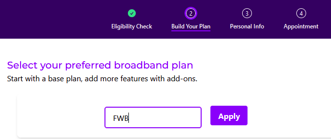 Description: The image above displays the "FWB promo code" on the new sign up broadband order portal.