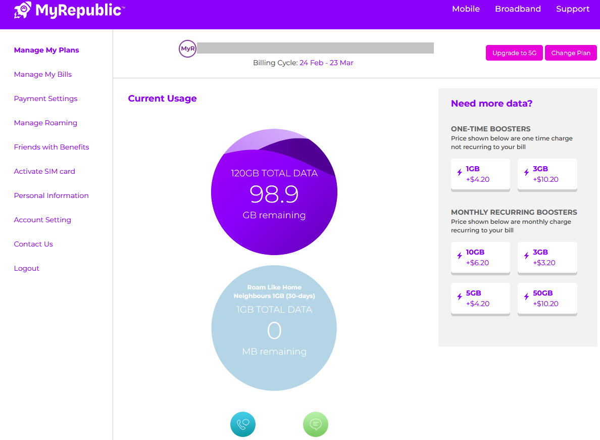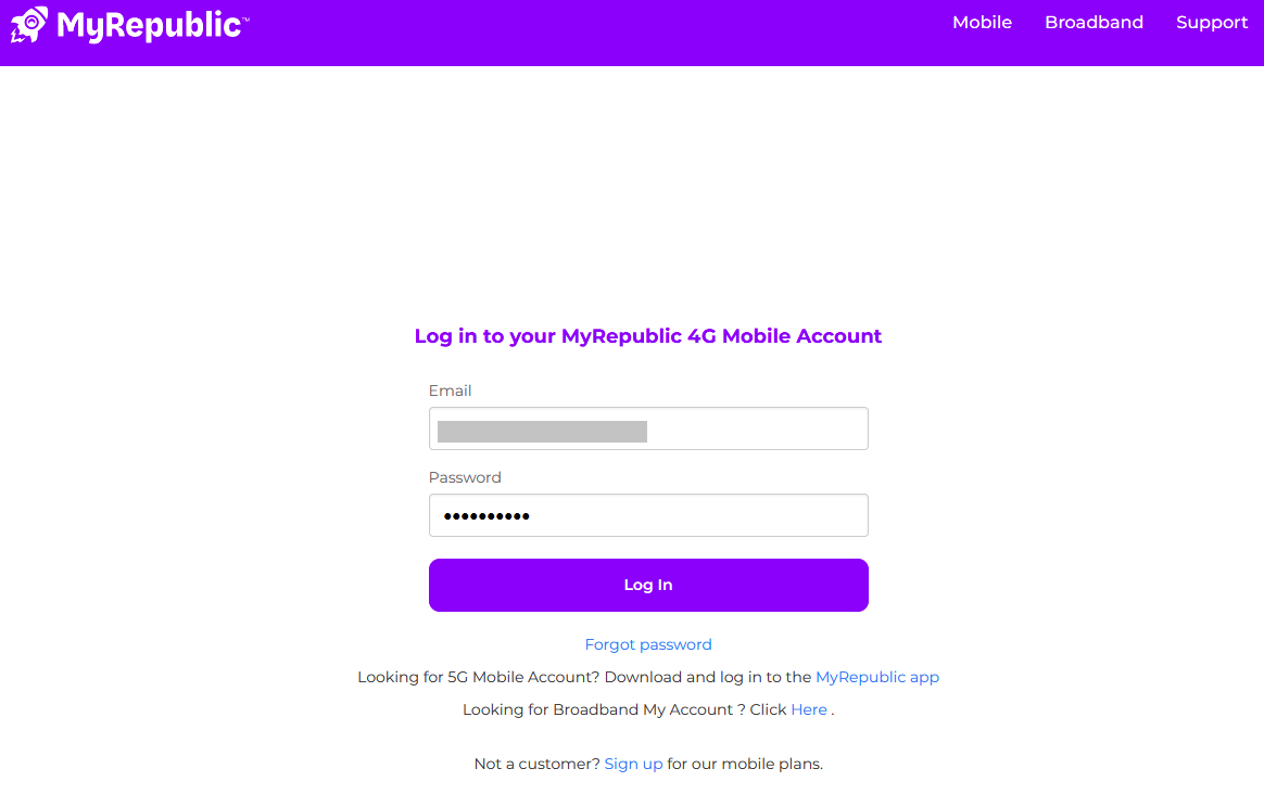 Description: The image above shows the login page for existing broadband customers who would like to sign up for a MyRepublic mobile service.