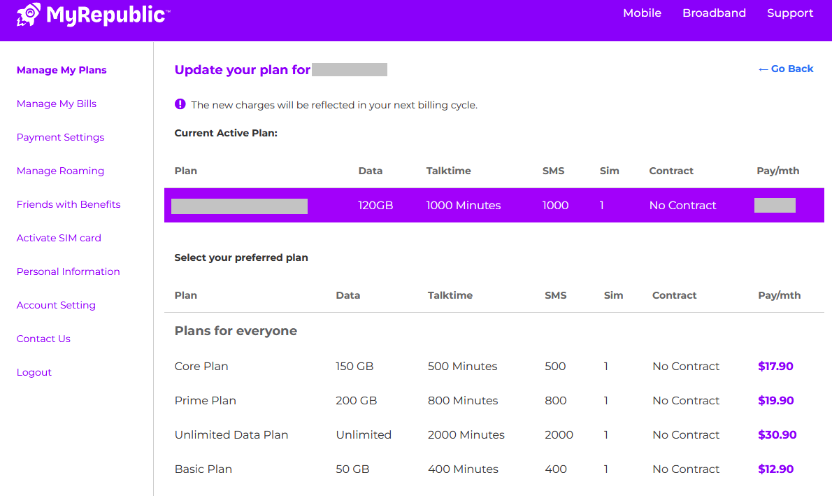 Step 3: If you see the “-$10.00” for the Unlimited plan, it means that you are eligible! Click "Next" and proceed with the change plan request and your new plan will take effect on your next billing cycle.