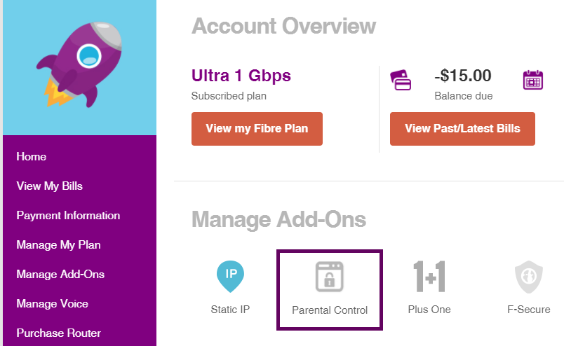 Description: The image above displays the "Parental Control" add on in Manage Add-Ons field on the landing page of Fibre MyAccount.