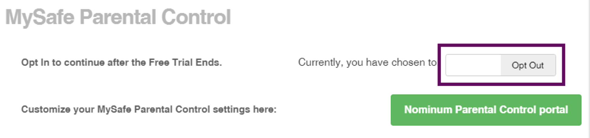 To opt-in, go to the MySafe Lite Parental Control page in your MyAccount and click on the button on the top right to switch your status from opt-out to opt-in.