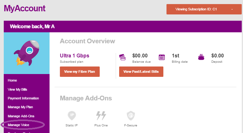 Description: The image above displays the "Manage Voice" tab on the Fibre MyAccount landing page.