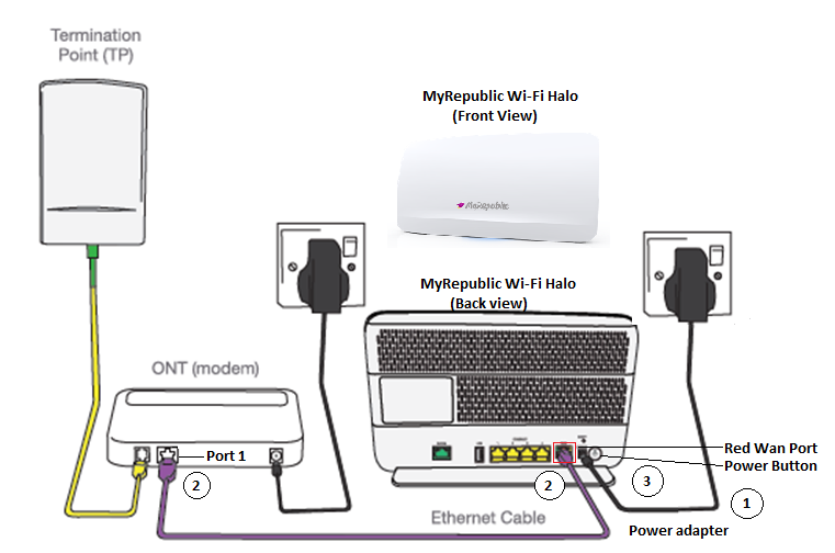 Description: The image above displays the correct device setup for a MyRepublic Fibre service which includes the Netlink Trust Termination Point, MyRepublic Modem (ONT) & Wifi Halo router. Additional peripherals include: Fiber patch cord, LAN cables and power adapters.