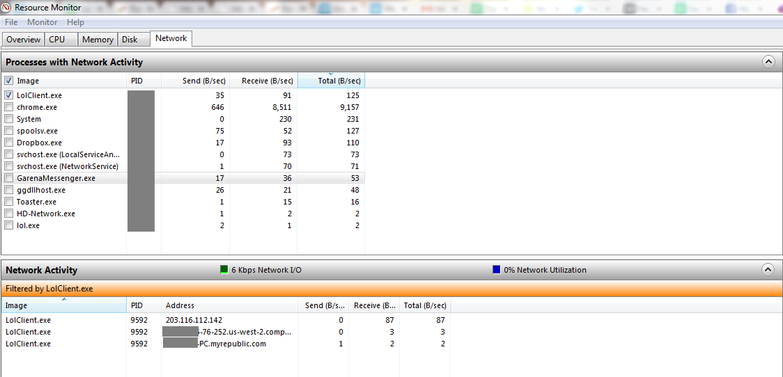 Below is an example using League of Legends in Resource Monitor, game IP is 203.116.112.xxx (the last few digits are irrelevant, the main address is the first 3 sets):
