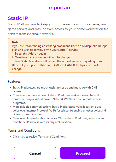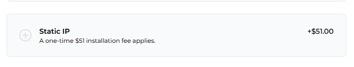 Description: The image above displays the "Static IP" pop up window with the details on the Static IP add-on that can be subscribed to during sign up.