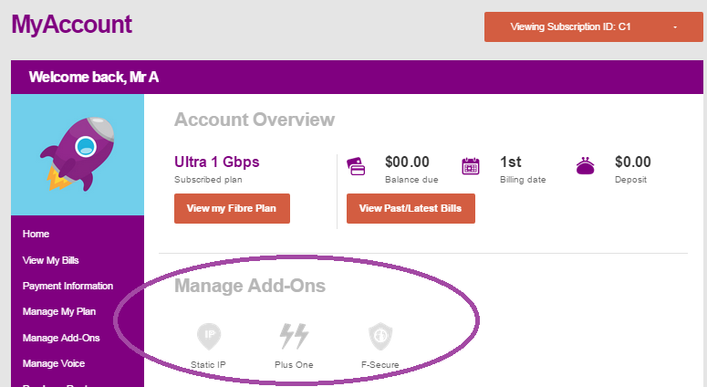 Description: The image above displays the "Manage Add-On" field on Fibre MyAccount where the customer may subscribe to Static IP after the service has been installed.