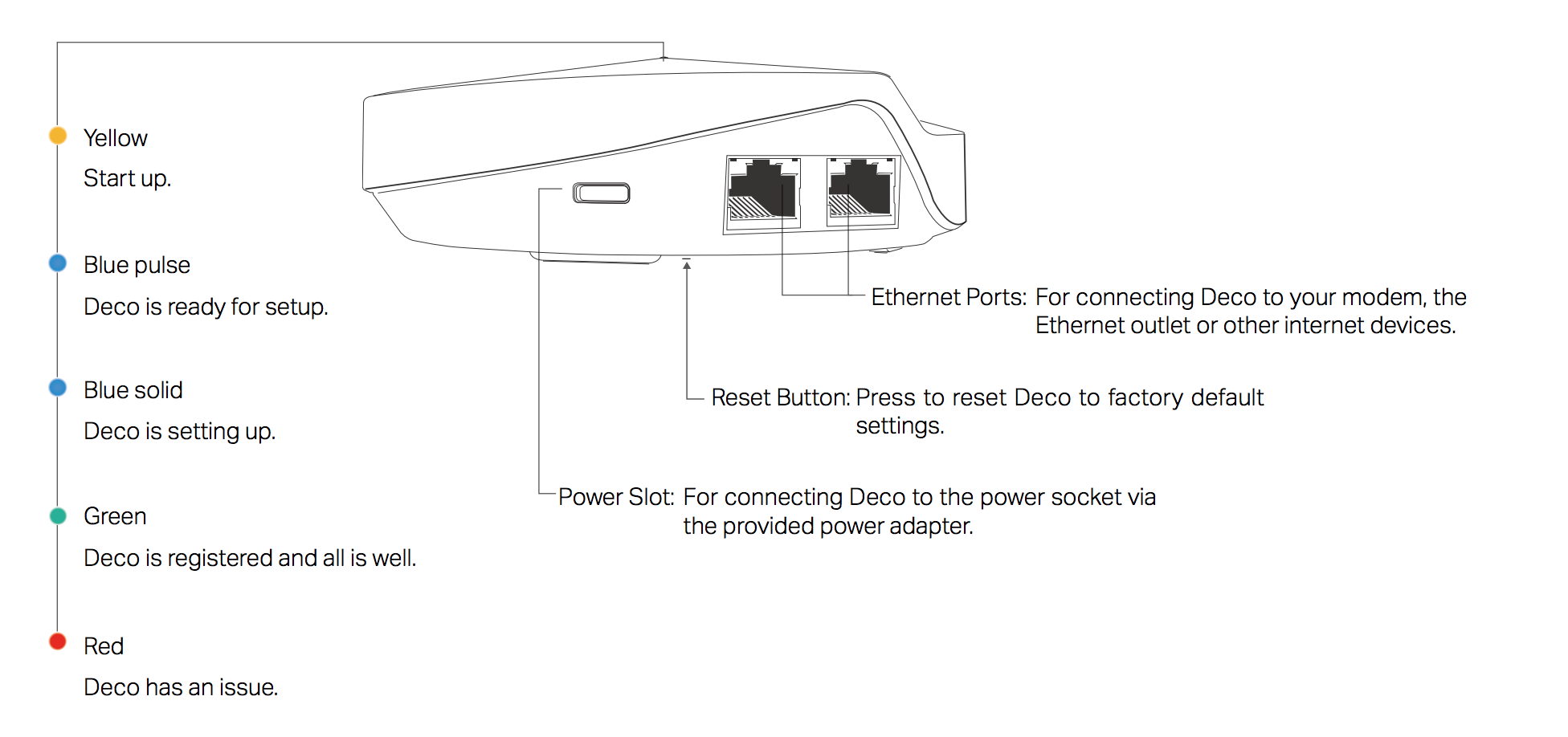 Each Deco unit has an LED that changes color according to its status, two RJ-45 Ethernet ports that function as either LAN or WAN ports, and a power slot.