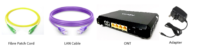 Description: The image shows the ONT set, which includes items such as a fibre patch cord, LAN cable, modem, and power adapter. These items will need to be returned when terminating the broadband service.