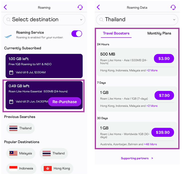 For 4G mobile service, the auto-renew function is available for Travel Boosters subscribed to the 24-hour and 7-day plans, so you can avoid the hassle of repurchasing additional data roaming plans. ๐๐