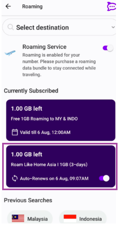 Should you opt to turn-off the auto-renew feature upon receiving the renewal message, this can be done from "Manage Roaming" landing page on the MyRepublic Mobile App. Toggle on the renewal button to turn on/off this feature. β βπ