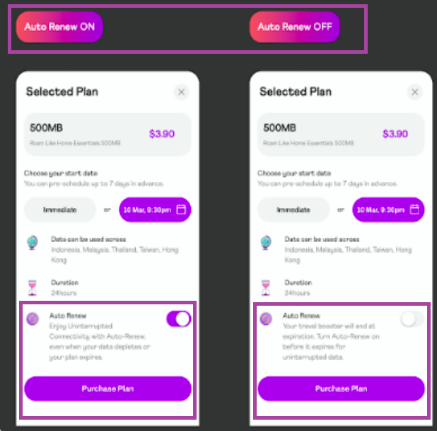 Auto-renew feature will need to be turned off when roaming service is no longer required to avoid the automatic renewal of the Travel Booster upon the return to Singapore.