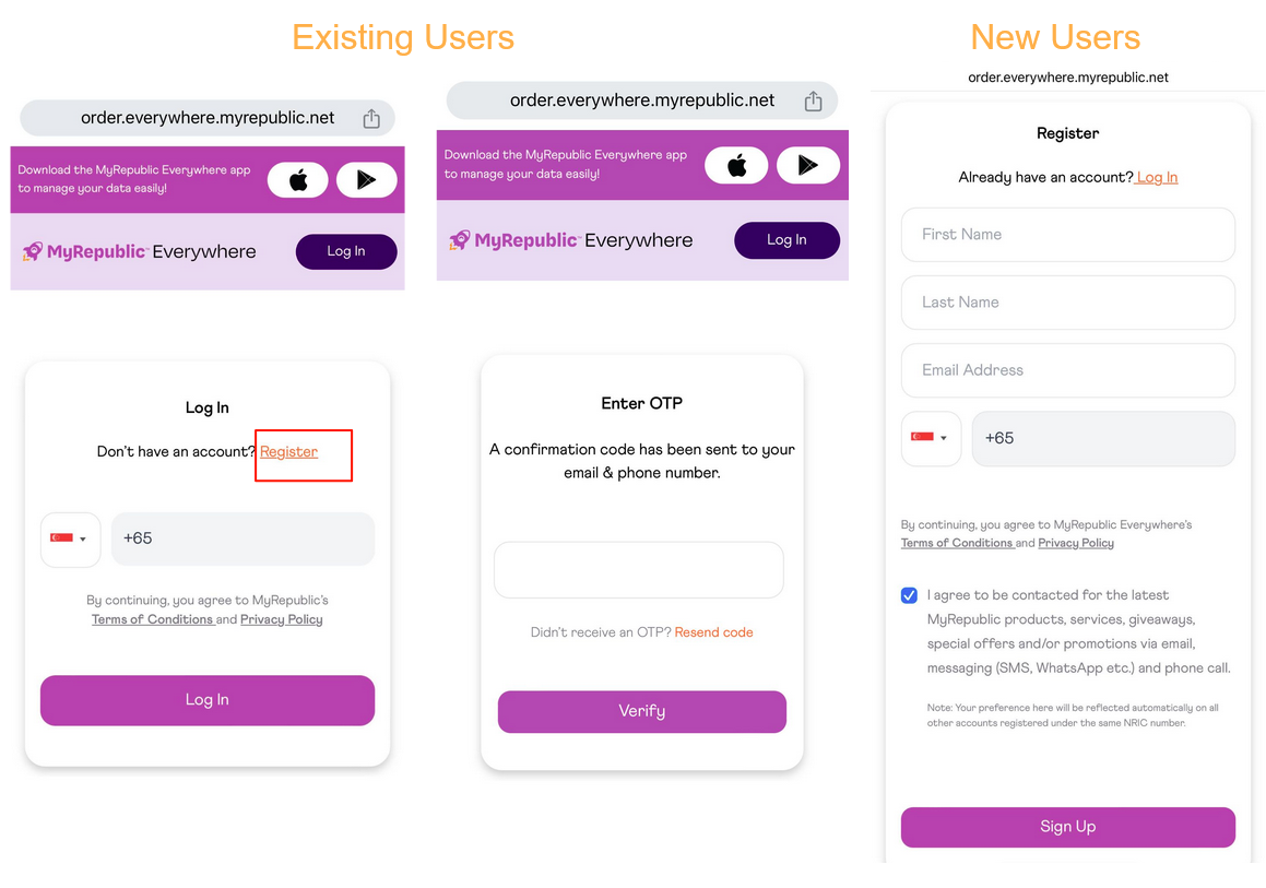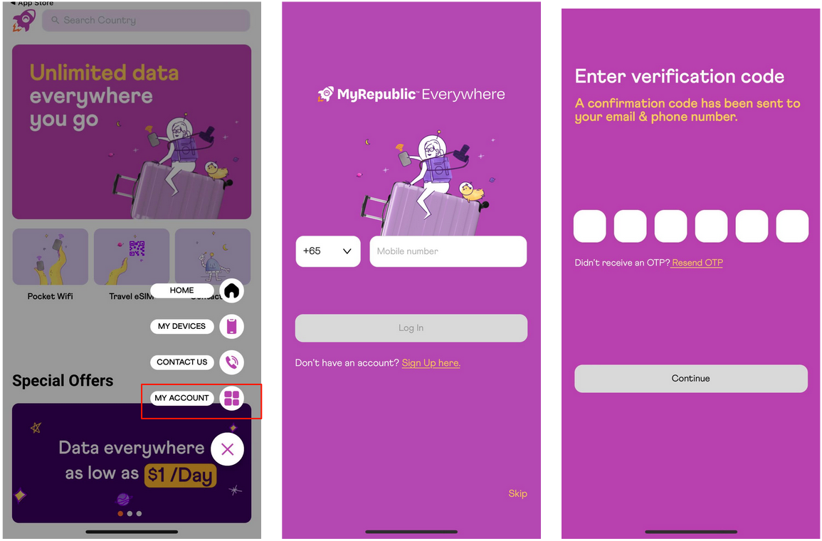 8. You can enter the OTP sent to your registered mobile number or email address and log in, if you already have an account with MyRepublic Everywhere.
