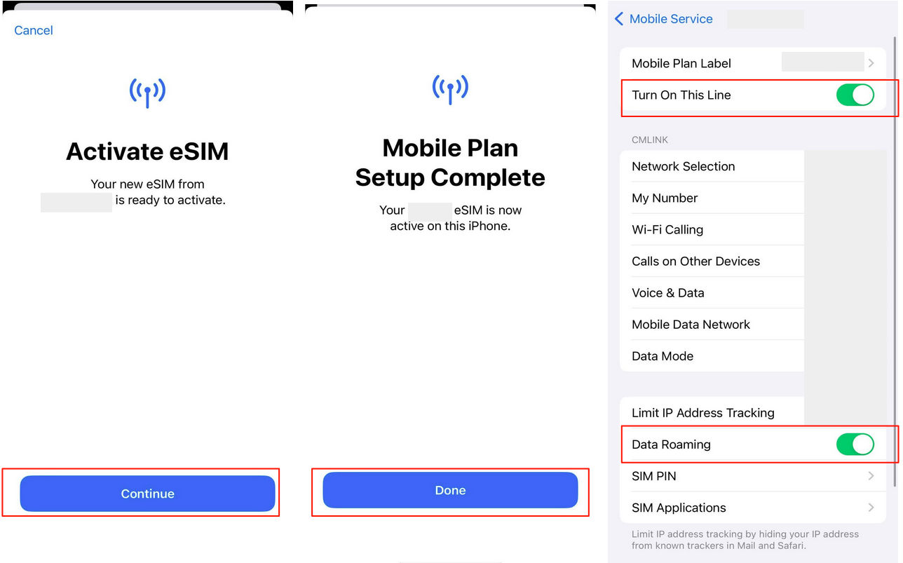 4. Activate your eSIM, tap on "Continue" then "Done"