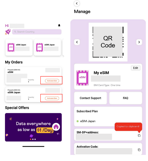You can scan the QR code or Enter Details Manually by pasting the SM-DP+ Address and Activation Code as displayed on the MyRepublic Everywhere App